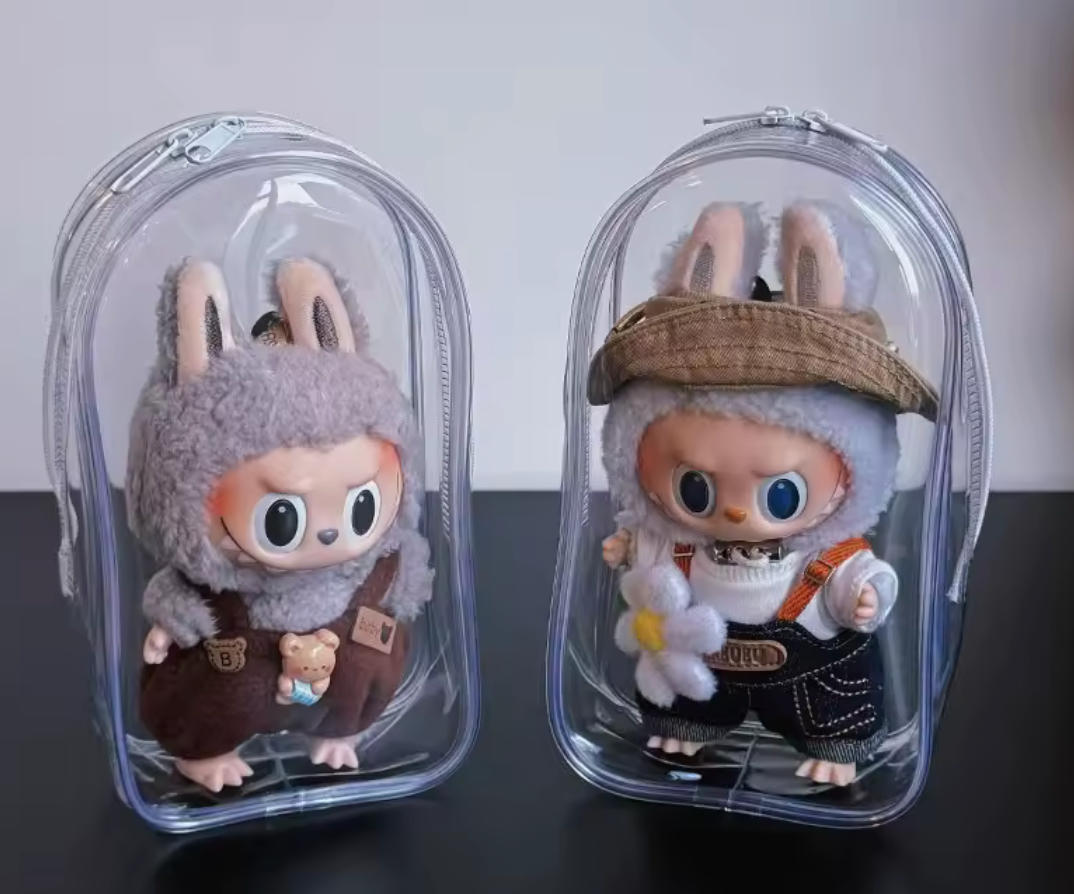Denne gjennomsiktige oppbevaringsbagen passer perfekt til 1 figur (ca. 18 cm), og gjør det enkelt å ta med Labubu på tur – eller vise den fram hjemme.